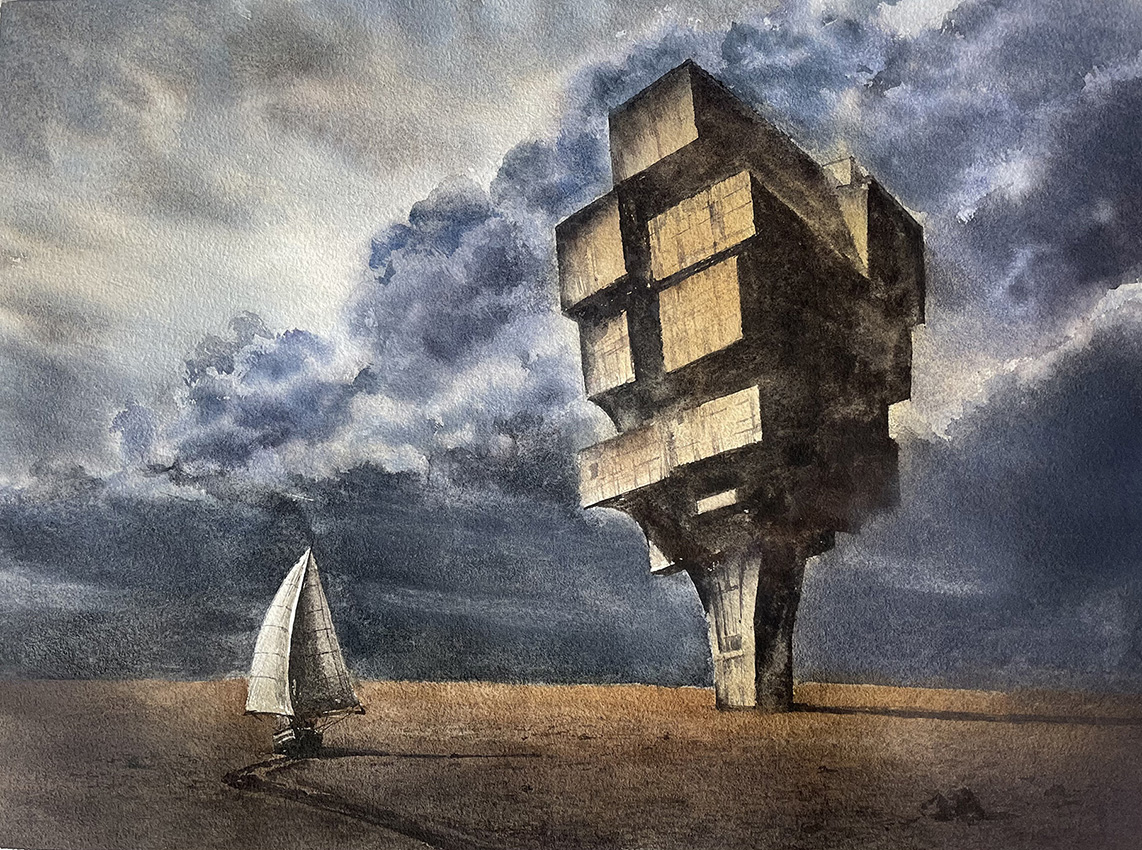 Elements such as a solitary boat and a gliding figure further project a sense of estrangement among subjects in contemporary society, revealing the inner logic and emotional impulses that give rise to this condition.